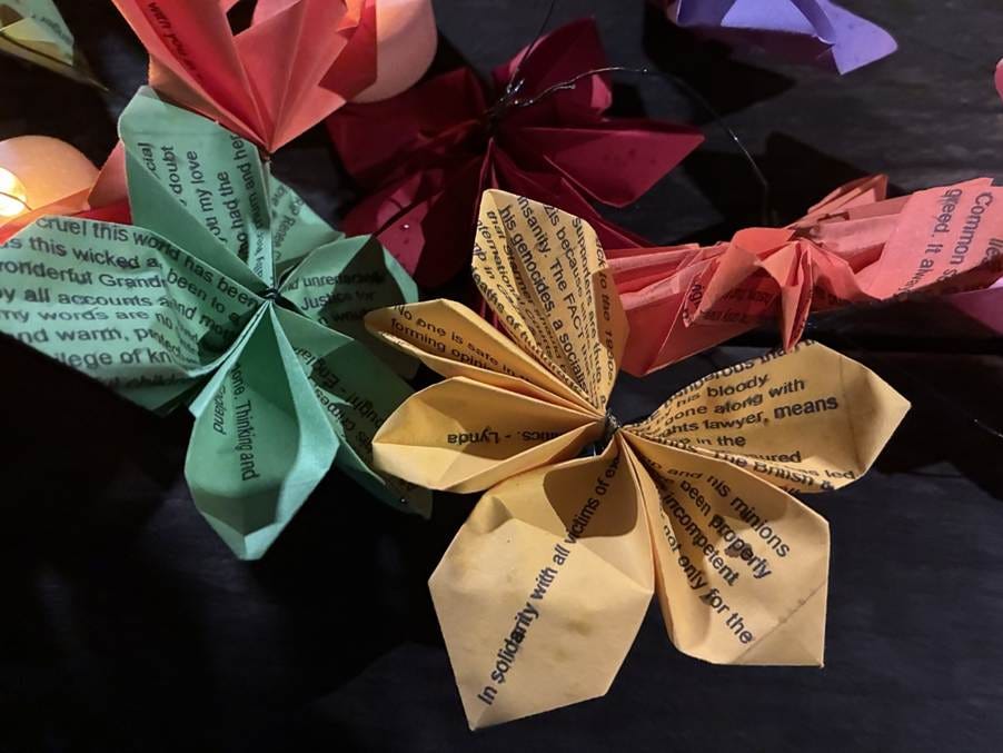 Paper flowers inscribed with messages from those who could not attend the Vigil.