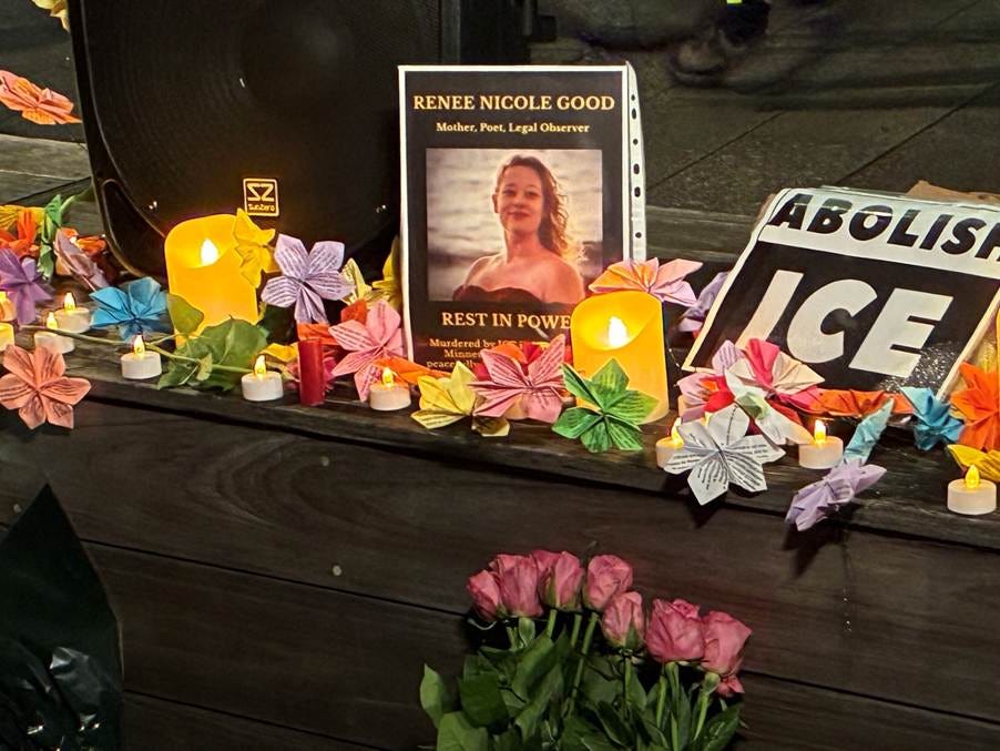 The vigil was inspired by the killing of Renee Good but was dedicated to all those killed by the plague of injustice that is ICE. (People all over the world are standing against the Trump and his tyranny – even tea drinking☕ Brit ones. America you are not alone).